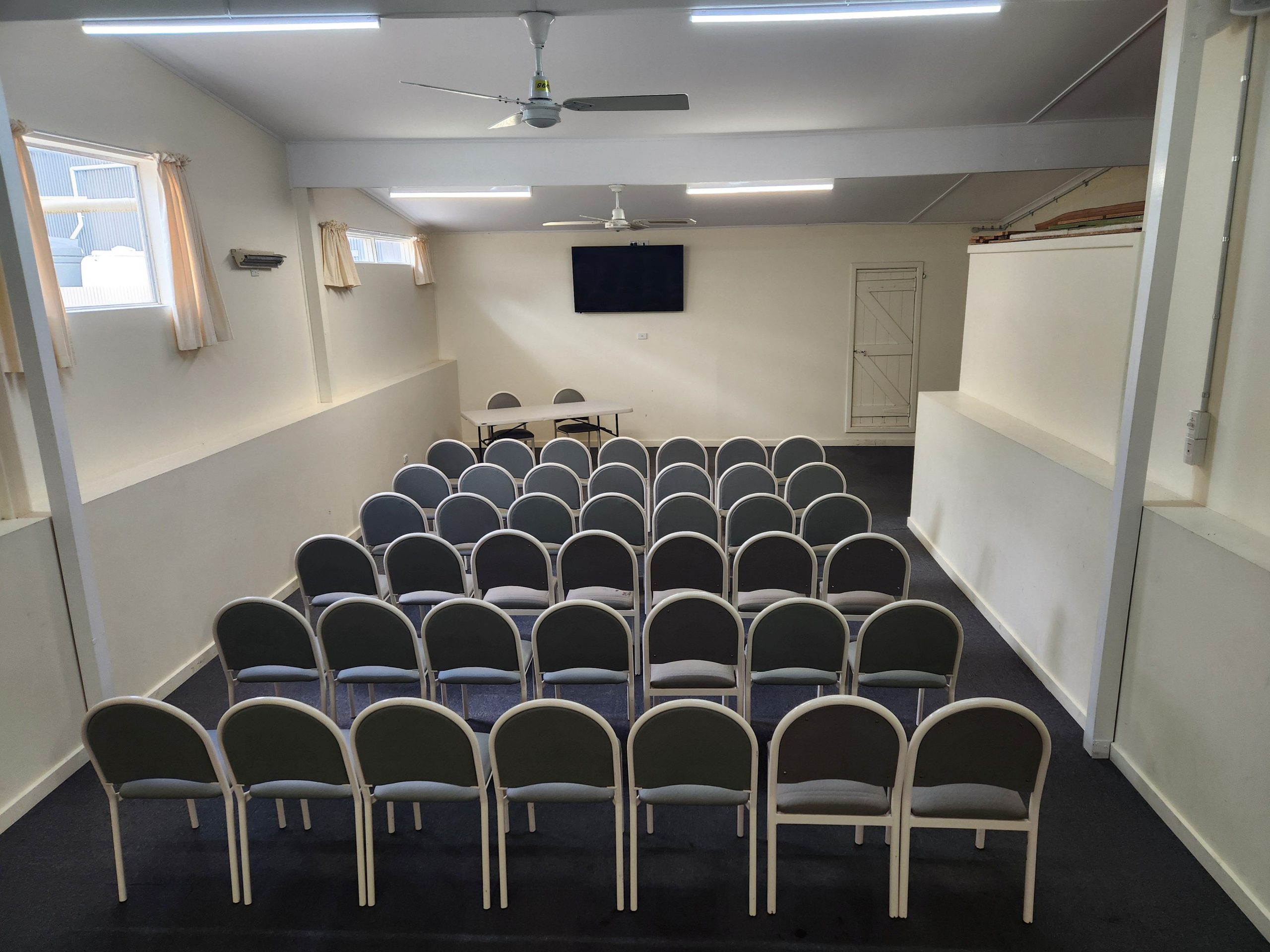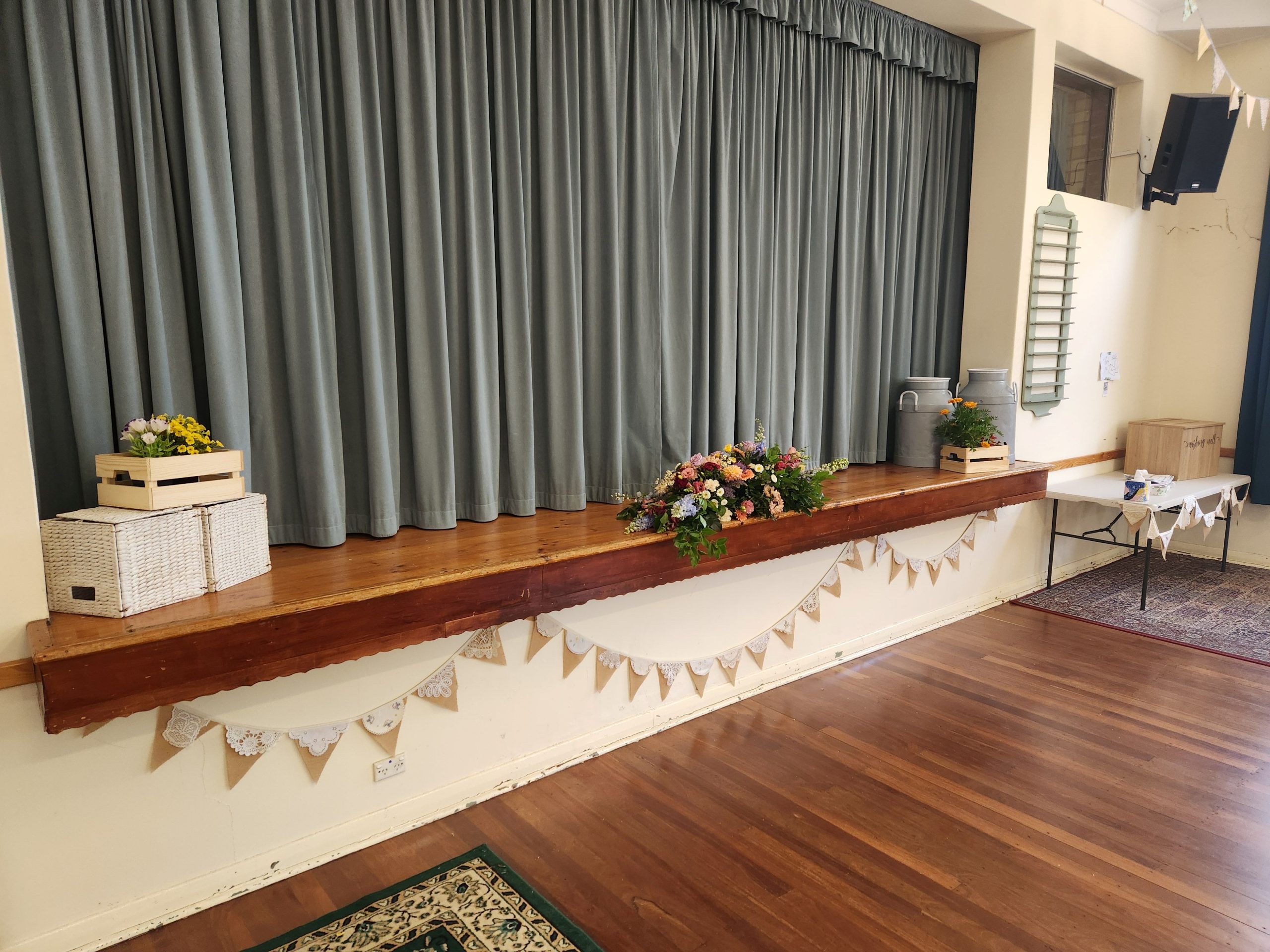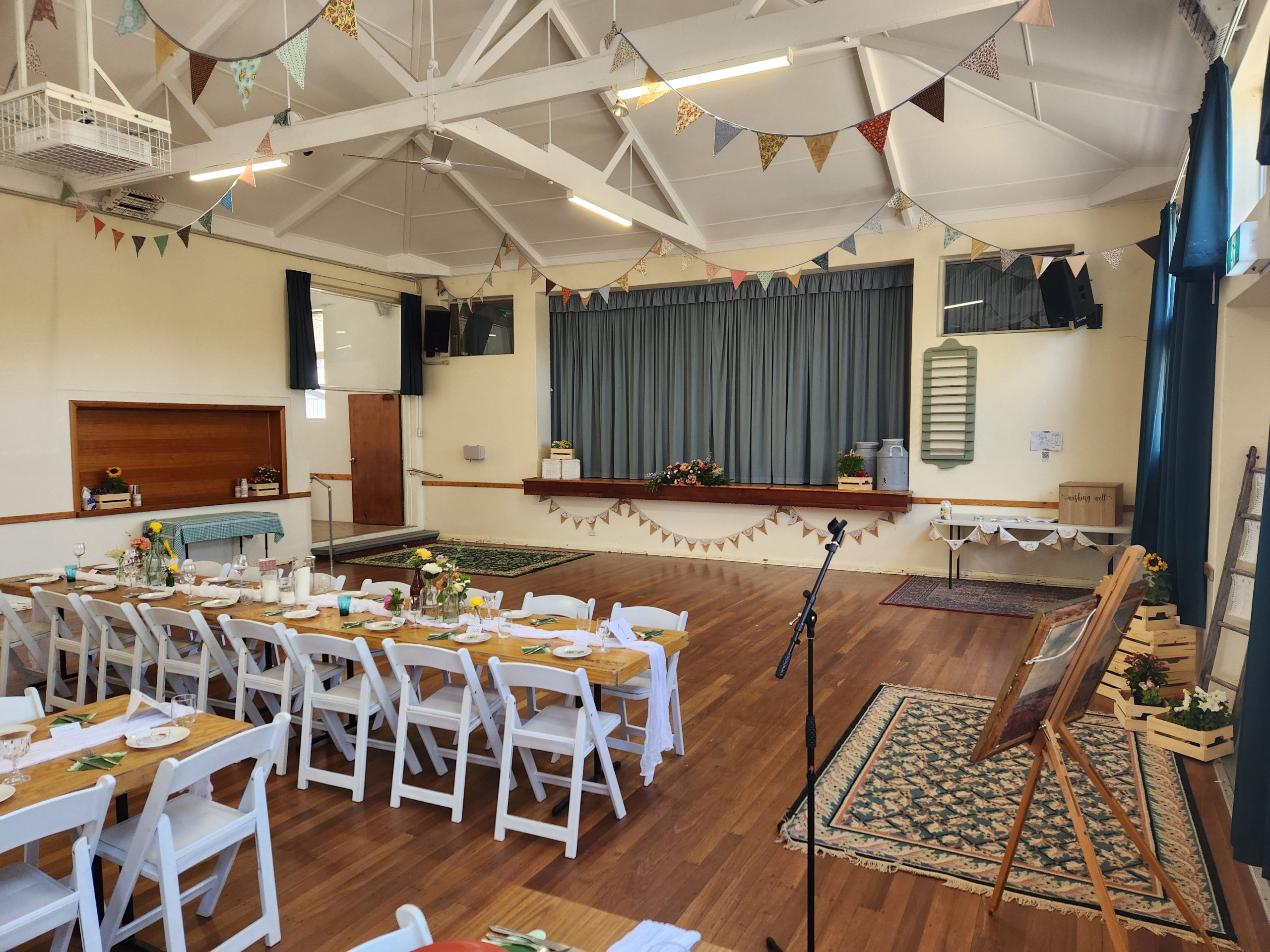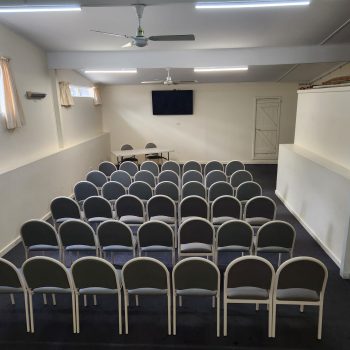 Main Hall & Stage – boasts a well-maintained timber dance floor, stage, PA system, heating and fans. This room can accommodate approximately 150 people when seated and approximately 200 people standing. This room is ideal for special events such as weddings, music events or dances etc. A projector and screen are also available (additional fee applies)